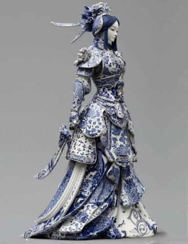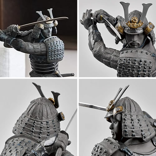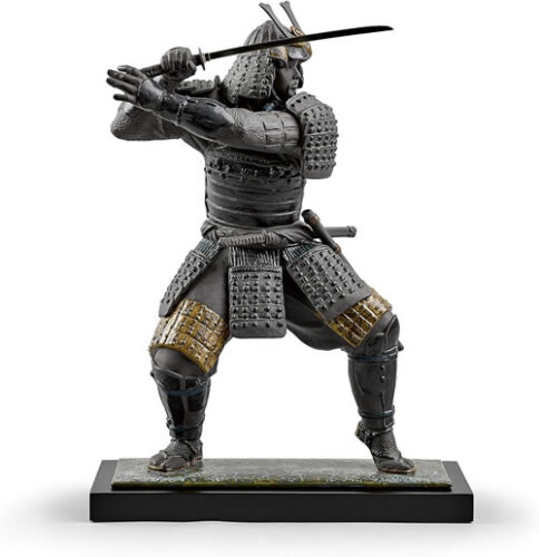 The Samurai Warrior sculpture is a porcelain figurine in black stoneware with blue enamels and earth tones, a steel catana