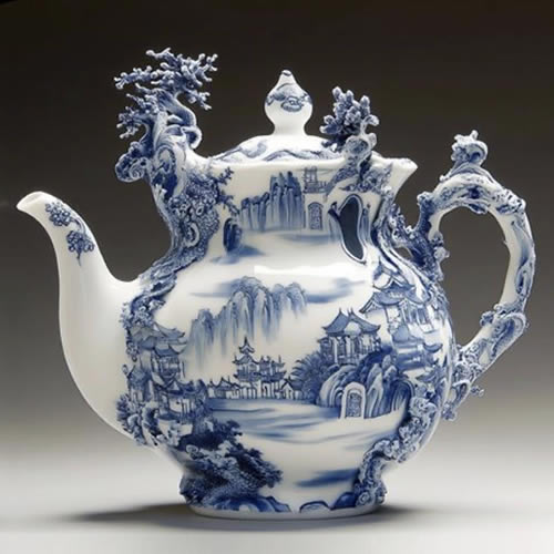 Someone sent me this photo of a teapot. Isn’t it amazing? She wanted to know where it could be purchased. I had time on my hands, so I started looking for it. I found similar teapots with cobalt blue fantasy Asian landscapes on white porcelain. But nothing I found had the three dimensional elements of the cherry trees on this teapot.