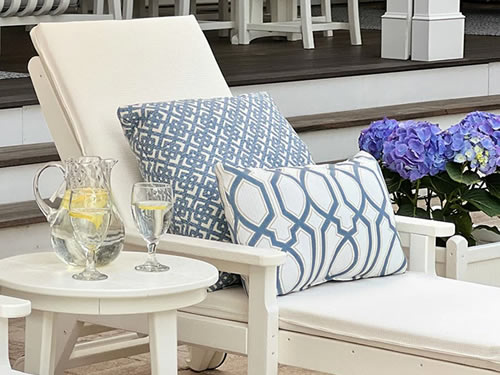 Polywood makes stylish, durable outdoor chairs, benches, lounges and swings, tables and storage, outdoor dining tables in two heights with seating, picnic tables, planters, cushions, market umbrellas, pillows and décor, even pet feeders. It is durable, built to be outside all year in all weather.