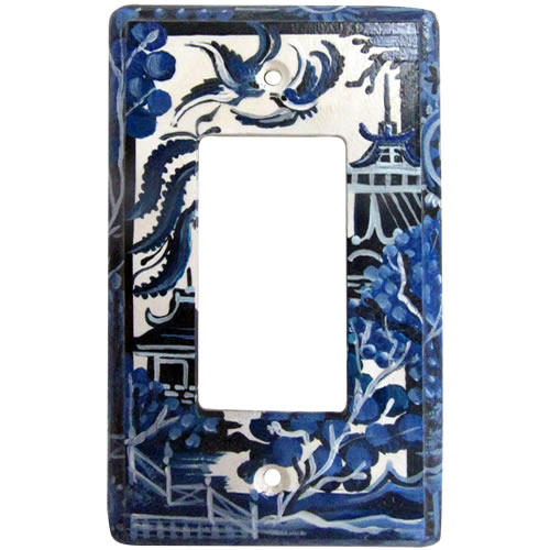 I have not found Decora style covers in Blue Willow porcelain. This version is hand-painted on a wood switch plate by Vermont artist Debbi Wetzel. You can find them on Etsy. They are blue and OFF WHITE, not white. They have lacquer over the paint, so they will last.